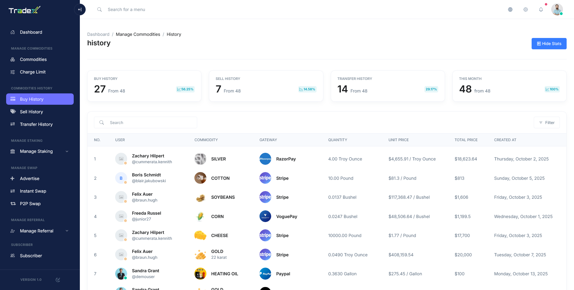 The Buy History section displays a complete record of all commodity purchase transactions made by users. Admins can review transaction details such as user information, asset type, amount, price, and date. It helps in monitoring trading activity and ensuring transaction transparency.