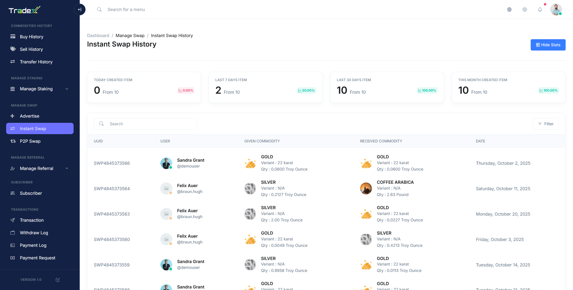 The Instant Swap section enables the admin to monitor and manage all instant exchange transactions between different commodities. It provides details such as swap pairs, exchange rates, amounts, and user information. This section ensures smooth and accurate real-time conversions across the trading platform.