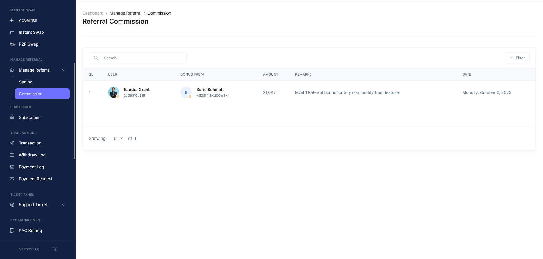 The Referral Commission section provides a detailed overview of all referral-based earnings on the platform. Admins can track commissions earned by users, view transaction details, and monitor payout status. This section ensures transparency and effective management of the referral reward system.