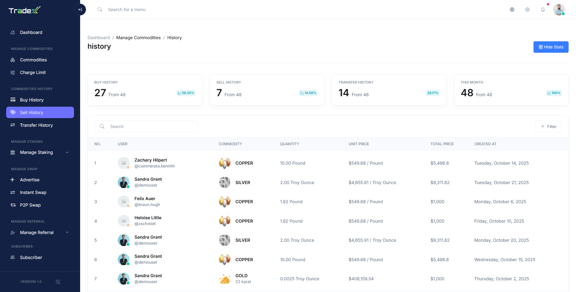 The Sell History section provides a detailed log of all user-initiated sell transactions. Admins can view essential details such as commodity type, sale amount, rate, user information, and transaction time. This section helps in tracking selling trends and maintaining transparency across the trading platform.
